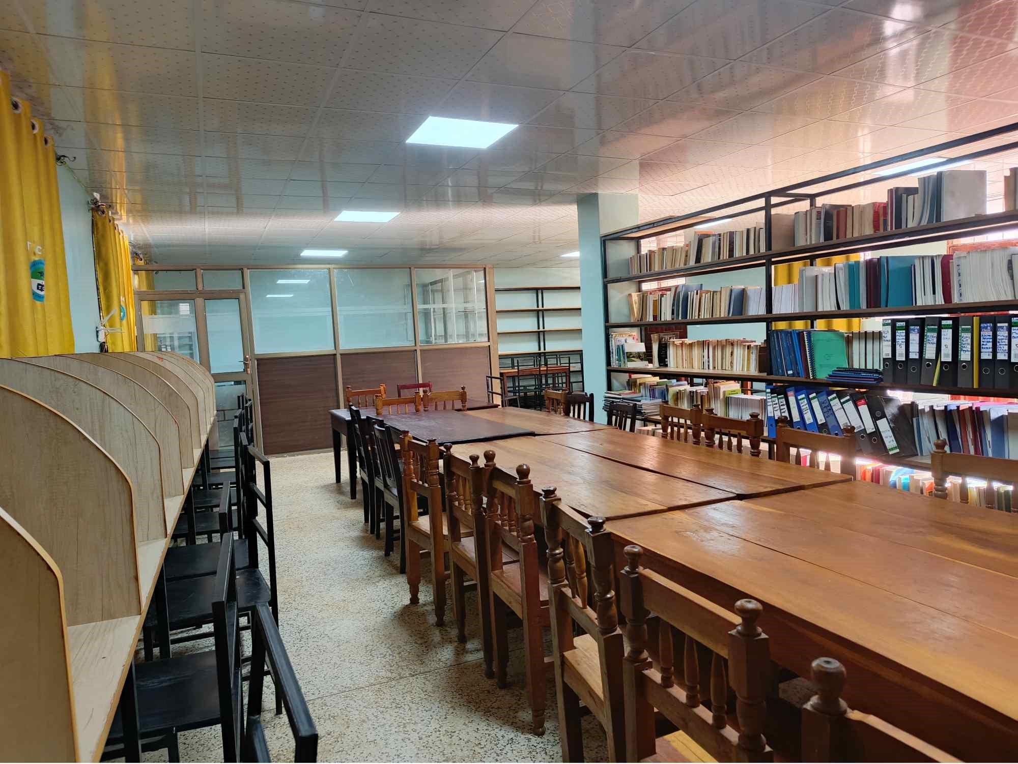 It consists of a sitting capacity of eighty users and print volumes, journal titles and students research reports plus electronic resources and wireless internet coverage enabling students and staff with wireless devices to access the internet while in and around the library.